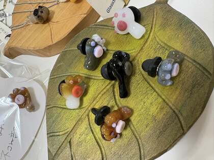 定番のアロマペンダントや泡しずくペンダントのほか、ガラスパーツ、自分で作る体験コーナーも準備しています。