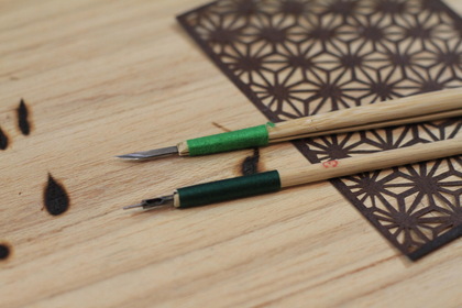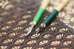 この「麻の葉」シリーズは、着物の型染めに使う、柿渋の糊で張り合わせた特別な和紙を彫刻刀で彫った麻の葉の型を使い制作しています。